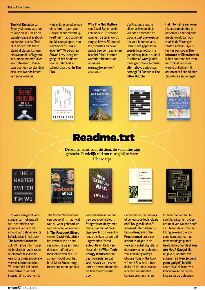 Bright, Internet & dagelijks leven, Internet & economie, Internet & politiek, OverigeTien boeken over internet om deze zomer te lezen 14 juli 2011 - Buiten is het koud en guur. Lekker weer om er een boek bij te pakken. (Hoewel ze later ook prima lezen op het strand). Hieronder tien tips voor boeken over internet. Gepubliceerd in Bright nummer 40, juni/juli 2011. Doorsturen:Delen Klik om dit te e-mailen naar een vriend (Opent in een nieuw venster) E-mail Klik om af te drukken (Opent in een nieuw venster) Print Klik om te delen op X (Opent in een nieuw venster) X Klik om te delen op Facebook (Opent in een nieuw venster) Facebook Vind-ik-leuk Aan het laden... Gerelateerd Gepubliceerd door - Bekijk alle berichten van -