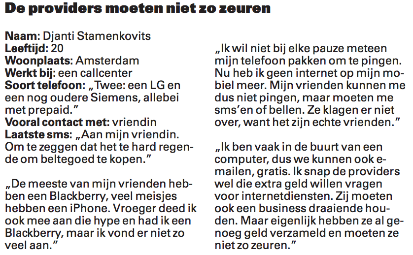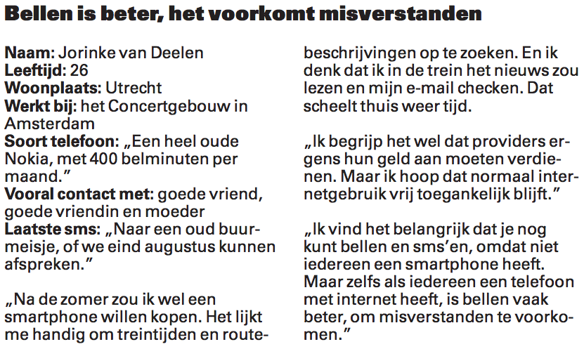 Internet & dagelijks leven, Interview, nrc.nextHoe gebruik jij je mobiele telefoon? 20 juli 2011 - Naar aanleiding van de nieuwe telefoon-abonnementen van KPN, drie verschillende telefoongebruikers aan het woord: Gepubliceerd in nrc.next op woensdag 20 juli 2011. Doorsturen:Delen Klik om dit te e-mailen naar een vriend (Opent in een nieuw venster) E-mail Klik om af te drukken (Opent in een nieuw venster) Print Klik om te delen op X (Opent in een nieuw venster) X Klik om te delen op Facebook (Opent in een nieuw venster) Facebook Vind-ik-leuk Aan het laden... Gerelateerd Gepubliceerd door - Bekijk alle berichten van -