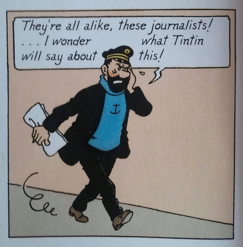 Benoit Peeters heeft het bij het verkeerde eind als hij stelt dat we Kuifje nooit aan een verhaal zien werken. Zie De avonturen van Kuifje in het land van de Sovjets (uitgave Casterman 1999) waar de reporter van de Petit Vingtième op blz 38 tegen Bobby zegt: ,,We moeten naar het hotel terug. Ik moet mijn artikel schrijven voor de krant.”Een paar plaatjes verder zit Kuifje aan tafel met een stapel beschreven papieren en vraagt hij zich af: ,,Zou ik nou genoeg kopij hebben?” Even verder likt hij een enveloppe dicht: ,,Ziezo, dat is gebeurd. Maar hoe krijg ik dat nou op de plaats van bestemming?’‘