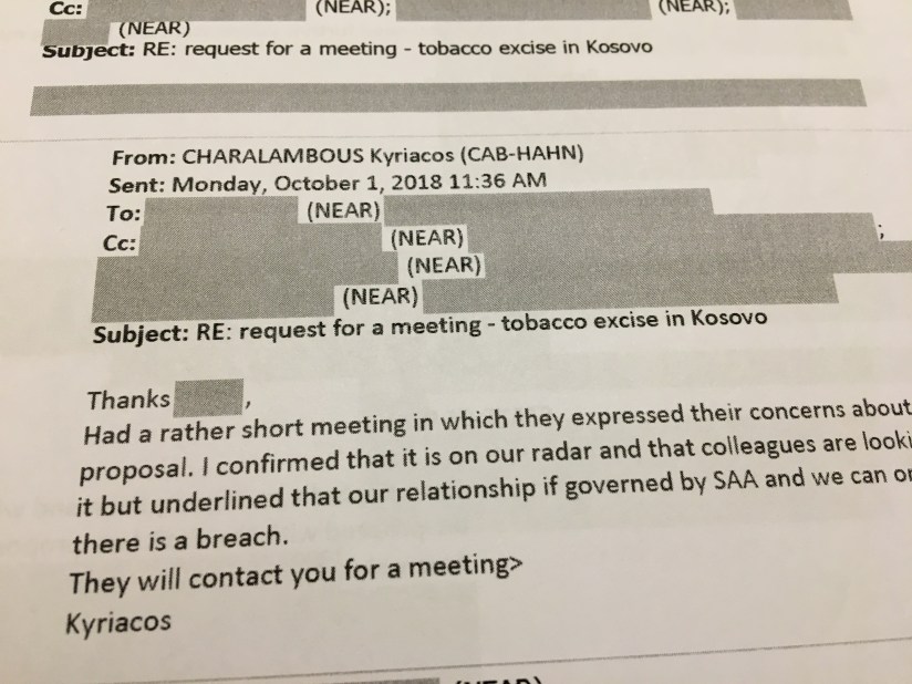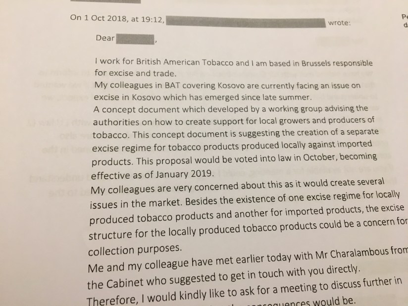 Een van de afspraken in het FCTC-verdrag is om transparant te zijn over gesprekken met de tabaksindustrie. Het advies is om gesprekken in het openbaar te houden, of wanneer ze achter gesloten deuren plaatshebben een verslag openbaar te maken. Dat principe is ook bij de Europese Commissie nog niet helemaal ingeburgerd. Zo was er een medewerker van de Eurocommissaris voor Europees Nabuurschapsbeleid en Uitbreidingsonderhandelingen die een e-mail ontving van British American Tobacco (BAT). De e-mail werd op mijn verzoek (grotendeels) openbaar gemaakt.