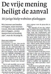 Rotterdam, 15 dec. Een van de Nederlanders die hebben meegedaan aan de cyberaanvallen namens Anonymous „kreeg het wel even benauwd” toen hij hoorde dat twee jongens waren opgepakt voor het tijdelijk platleggen van websites. Toch ziet de 16-jarige scholier uit Rotterdam, die alleen met zijn voorletter B in de krant wil, geen reden waarom juist hij zou moeten vrezen voor arrestatie.